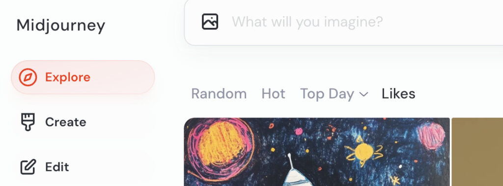 2. Exploreを開く: 左側のメニューの「Explore」をクリックすれば、自分の画像だけじゃなくて、他のユーザーが作った画像も見れます
